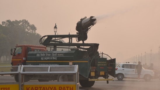 दिल्ली को राहत बिगड़ती वायु गुणवत्ता यह अल्पकालिक था, क्योंकि केंद्रीय प्रदूषण नियंत्रण बोर्ड (सीपीसीबी) के दैनिक बुलेटिन के अनुसार, राजधानी में शनिवार को वायु गुणवत्ता सूचकांक 303 दर्ज किया गया, जिसे “बहुत खराब” के रूप में वर्गीकृत किया गया था – इसके एक दिन बाद शुक्रवार को 24 घंटे के औसत AQI में 150 अंक का सुधार हुआ। रविवार को नई दिल्ली में कर्तव्य पथ पर भारी धुंध के बीच एंटी-स्मॉग गन पानी का छिड़काव करती हुई। (साथिया) शुक्रवार को AQI 218 था, जिसे CPCB द्वारा “खराब” के रूप